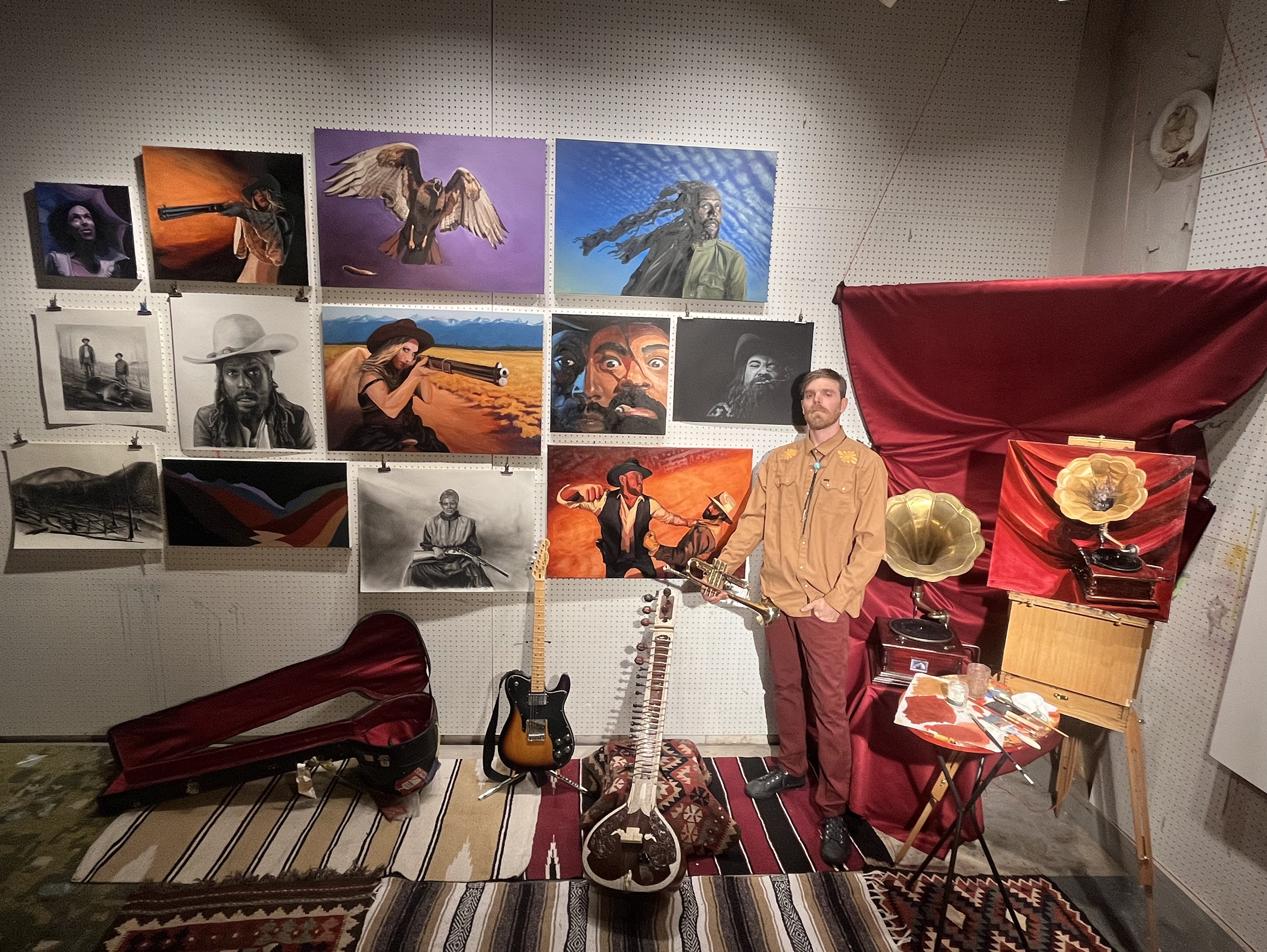 I scored this gorgeous and fully functional wind-up gramophone from my friend and bandmate, Neil “King Cornelius” Batterson. I was drawn to its combination of beauty and Newtonian physics given its prevalence of use during the late 1800s-1920s. When I was painting some other works for Cazador del Oso storyboard, I found this gorgeous crushed red-velvet to fabric at a second hand store down the street and brought it into the studio to create a backdrop that invokes a whimsical closing-of thick red theater curtains in an imaginary live-theater production “Intermission”. Once I brought the velvet into the studio and explored the draping contours, and the lighting, I couldn’t resist attempting a live still-life oil painting. What makes it even more unique and special to me is, I was using my late Grammy’s Sears-brand oil paints from the 1960s that ended up in my keep. -among all the oils I used in the creation of these images, her Sears brand oil paints were undoubtedly the highest quality, and remained perfectly usable. What a way to honor her life!